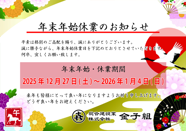 誠に勝手ながら、当社では以下の期間を年末年始休業とさせていただきます。
