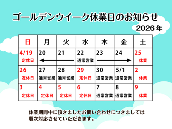 GW休暇のお知らせ2026 いつもホームページをご覧頂き、ありがとうございます GW休暇のため下記の通り休業させて頂きます 何卒ご了承くださいますようお願い申し上げます 期間中の電話・メール等のお問合せにつきましては順次対応させていただきます ◀前の記事へ 次の記事へ▶