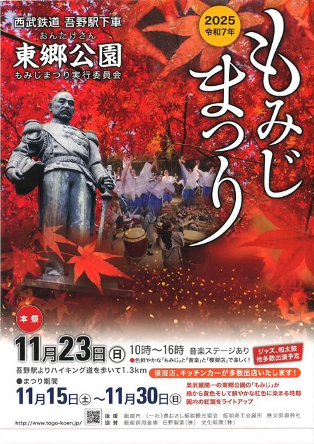 令和7年もみじまつり 今年も東郷公園秩父御嶽神社では11月15日~11月30日で 「もみじまつり」が開催されています ステージでの演武や模擬店などの出店がある本祭は 11月23日(日)の10時~16時になっています ■東郷公園 秩父御嶽神社 https://togo-koen.jp/schedule/momijimatduri/ ◀前の記事へ 次の記事へ▶